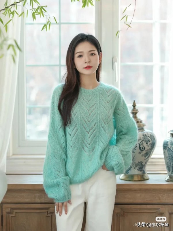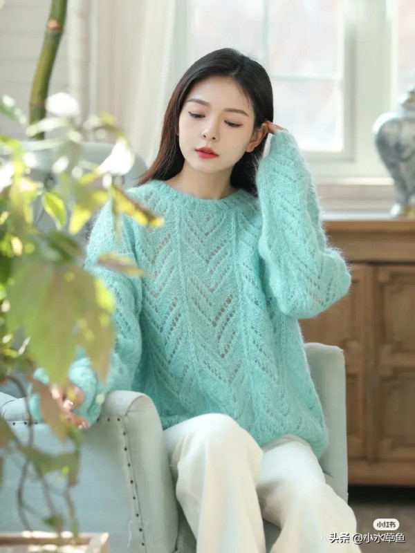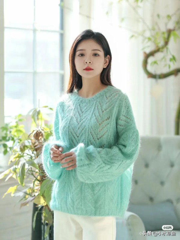 薄荷绿色系的镂空花样毛衣很有春日气氛哦,马海轻盈的同时毛感也比较丰盈,很受织女姐妹们的喜爱,圆领和宽松款式的设计慵懒又不挑身材