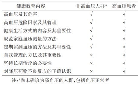 基层医疗卫生机构应积极、持续地应用权威、科学的科普资料,通过多种形式(如短视频、直播、公众号、广播电视、线下讲座、书籍、海报等)组织开展针对居民的健康教育工作,提高居民对高血压的认知水平和自我管理能力。针对各类人群的健康教育内容可参考相关指南,以确保健康教育的针对性和有效性。