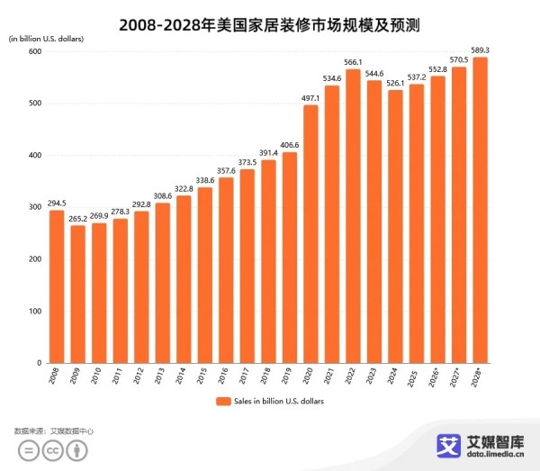 艾媒数据中心(data.iimedia.cn)显示,2008-2025年美国家居装修市场市场规模整体呈现增长态势。2008年,美国家居装修市场规模为2945亿美元,2009年市场规模下降至2652亿美元。但在2010年,美国家居装修市场规模迅速恢复至2699亿美元。