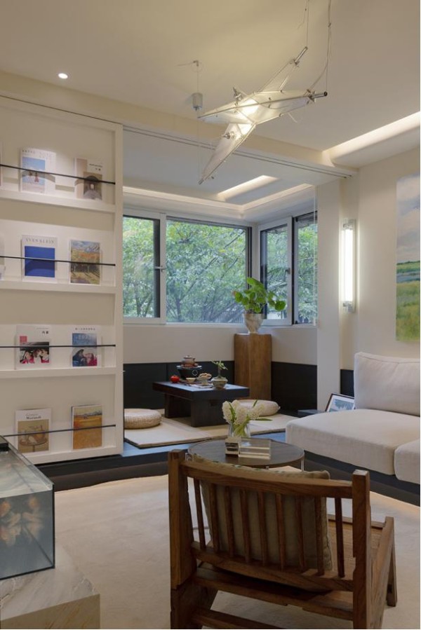 阳台也不再只是附属区域,而被重新定义为可休闲、可使用、可居住的多功能空间。榻榻米在此既可坐、可躺,也可作为临时休息使用。通过可移动推拉门进行分隔,阳台在需要时可独立成为小型客房,提升空间弹性与应变能力。