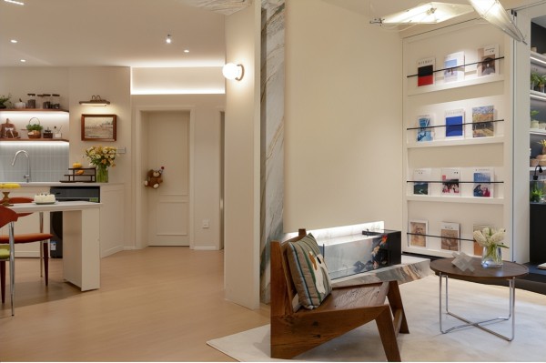 设计师打开原有厨房墙体,重构为开放式出餐一体空间,使厨房、餐厅与辅助功能区形成高效整体。异形墙体被转化为从地到顶的定制柜体,大幅提升储物能力。柜体系统强调“隐形收纳”,冰箱门式储物与整面定制柜融入空间;柜体侧面为宠物预留用餐与粮食收纳区域。
