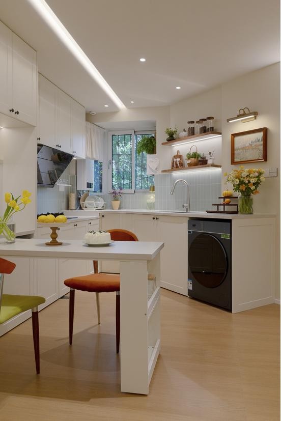 餐厨空间整合了用餐、烹饪、洗衣、储物与拍摄等功能,在有限面积中实现高效使用。墙面选用绿色加工砖,与客厅电视墙岩板形成呼应,增强空间整体性与视觉延伸感。