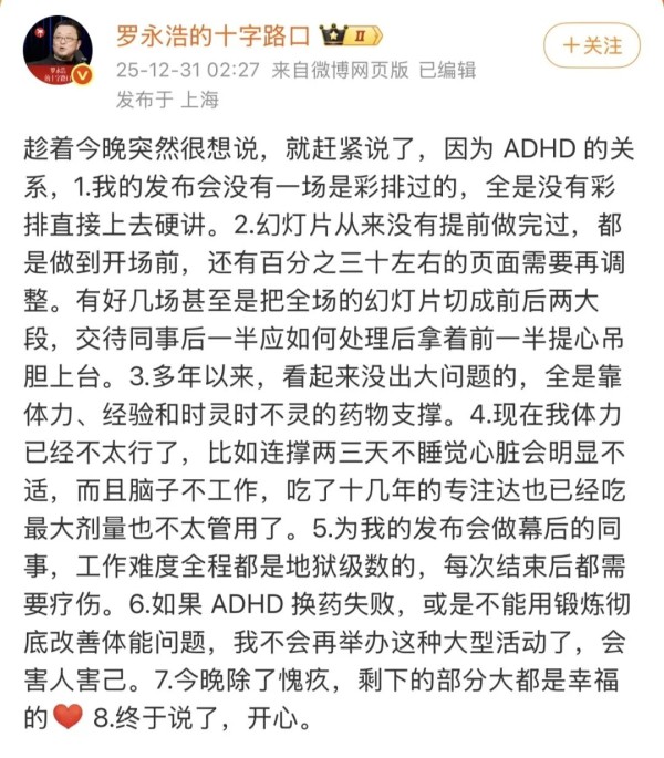 次日凌晨两点多,他在微博发文解释称,自己长期受注意缺陷多动障碍(ADHD)影响,由此带来了不少现实问题。比如,自己的发布会都是没有彩排直接上去硬讲;幻灯片从来没有提前做完过;他目前体力不太行,已服用专注达十多年,但目前服用最大剂量也不太管用;如果ADHD换药失败,或是不能用锻炼彻底改善体能问题,不会再举办这种大型活动。