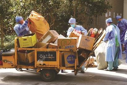 德康居委会筹备组书记沈逸文告诉记者,小区实施封闭管理后,德康雅苑小区共有12个楼道,其中一个楼道被封,居民只能在家里活动,其他11个楼道的居民可以在小区范围内活动。小区里有一个统一的垃圾房,每天,被封楼道居民的生活垃圾由社区物业人员和志愿者人工穿着防护服,逐层逐户收集。“居委会给小区每户居民都发放了黄色垃圾袋,生活垃圾装入袋后,投放在专门的垃圾桶里。”沈逸文说,这些生活垃圾再被装进两层黄色的医疗垃圾袋内,进行封口、消杀,随后转运至小区垃圾房,由垃圾清运公司收运。