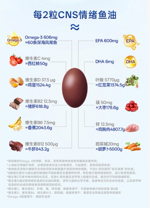 对于无暇精细搭配饮食的都市人群而言,cns情绪鱼油的复合配方实现了“一粒全覆盖”的便捷补充模式。无需复杂的营养搭配,每日规律补充即可为身体提供情绪调节所需的全维营养,逐步提升情绪韧性,帮助抵御长期压力带来的情绪耗竭。