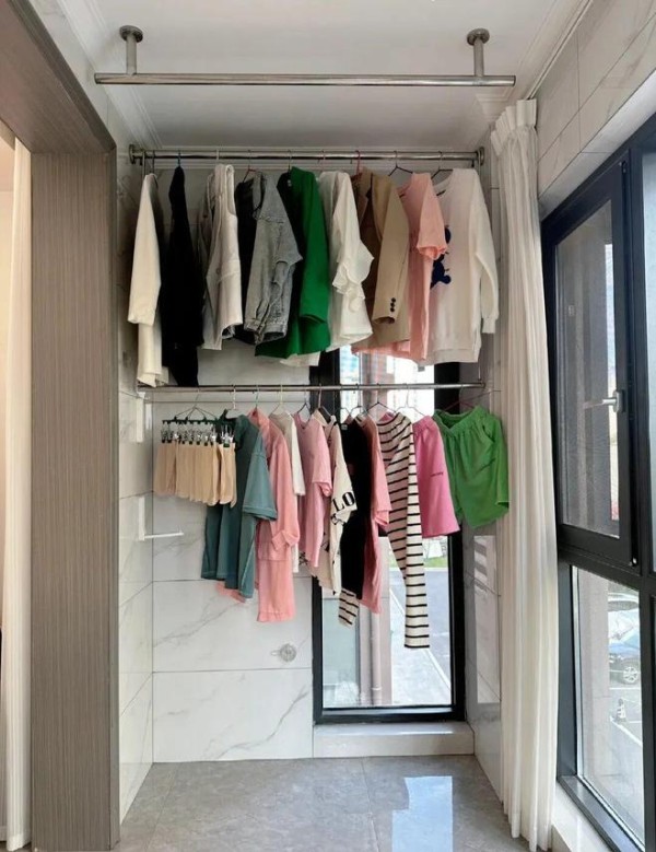 阳台天天挂着晾衣杆,一开门,从客厅看上去,整个阳台花花绿绿的衣服,床单、被子…整个家看上去毫无美感。