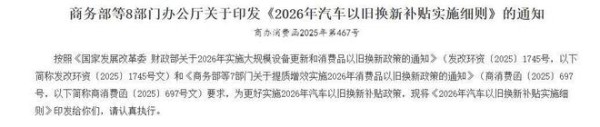 在2025年末,2026年汽车以旧换新补贴政策正式公布。与汽车购置税减免新政一样,补贴力度相较2025年有所减少。比如,2026年报废旧车,再置换新能源车,需新车价格在16.6万以上,才能拿满2万元补贴。那2026年新政策,还有哪些变化呢?两分钟带你了解。