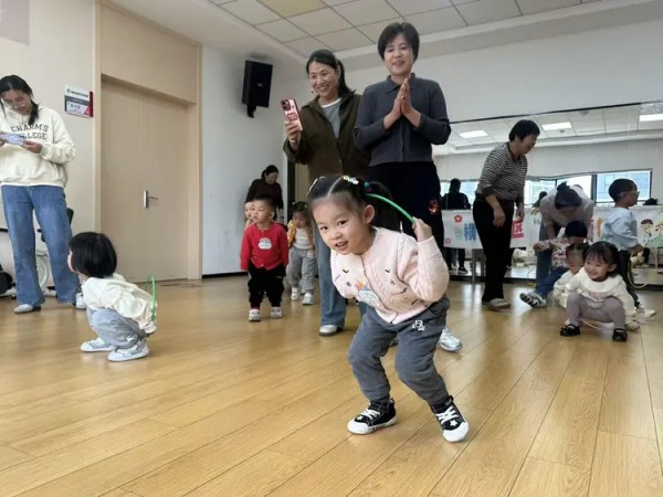 “小蛙跳”环节充满欢声笑语。老师示范“双脚并拢、屈膝起跳”时,孩子们立刻蹦跳着化身“小青蛙”,不少家长也兴致勃勃地脱下外套,弯腰俯身,与孩子们一同跳跃。当有孩子因体力不支坐在垫子上休息时,家长立刻递过温水,轻声说:“我们休息两分钟,再比一次‘慢跳比赛’好不好?”一次次起跳落地间,孩子强化了下肢力量,更在家长的包容里学会“接纳自己的速度”。家长弯腰陪跳的身影,成为亲子教育里“平等陪伴”的最好模样。