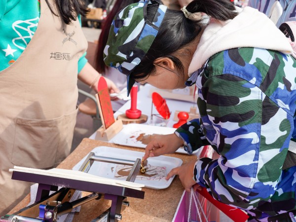 展售专区的10个主题摊位前人头攒动,版画、中国画、书法、陶瓷、珐琅彩、广彩等传统艺术作品,与“马”元素文创产品、工艺品、艺术衍生品上千件集中亮相,既有收藏价值,又兼具实用趣味,满足了不同学子的喜好。互动体验区更是热闹非凡,挥春送福、版画制作、拓印体验等实践项目依次排开,观众亲手参与创作的过程中,近距离触摸到了传统文化的温度与艺术创作的乐趣。
