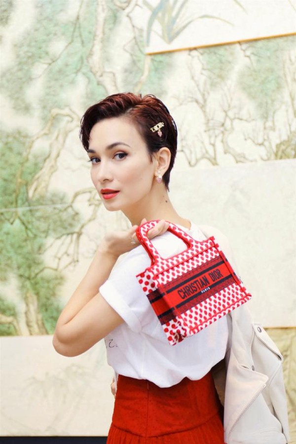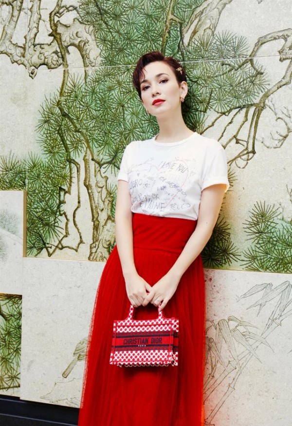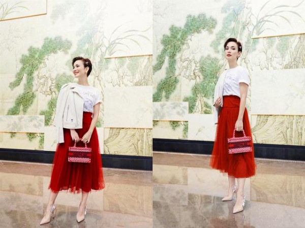 又被卢靖姗美到了!白T恤+红色半裙气质优雅,“赫本头”太抢镜