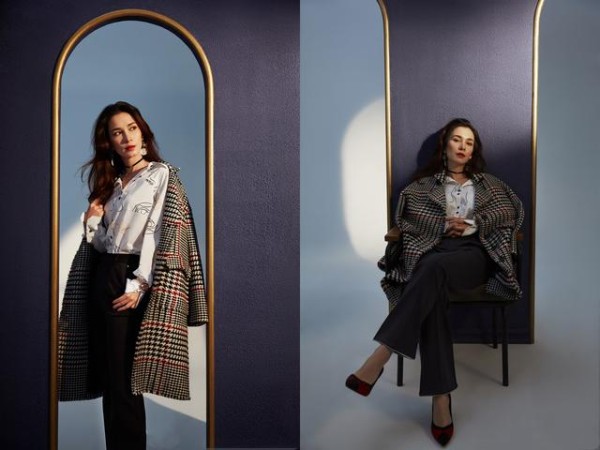 如果天气比较寒冷的话,可以套一件格纹大衣,温暖还洋气。