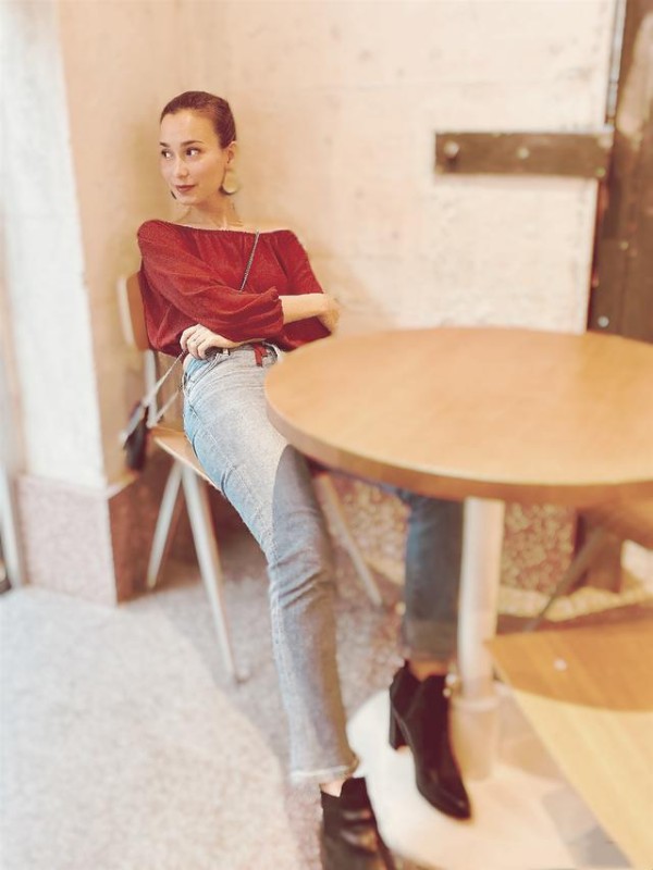 红色的上衣搭配紧身的牛仔裤,时髦有度,红蓝cp,也是格外的抢眼。