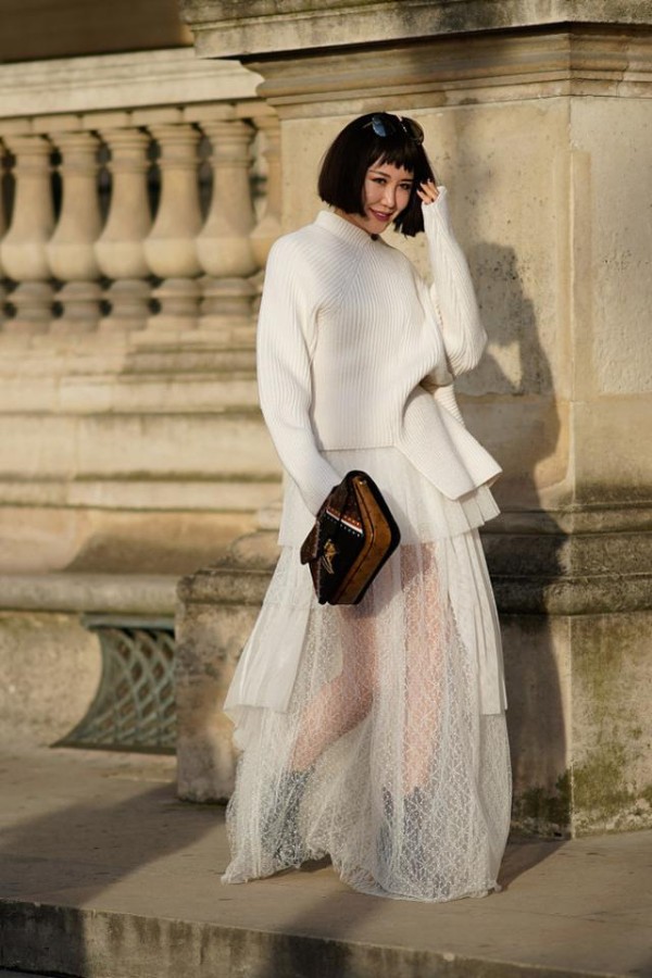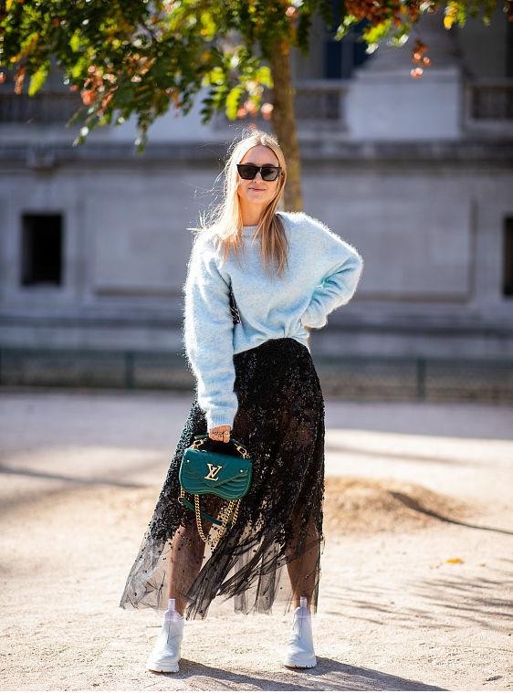 同时纱裙在冬天穿着,也格外的时髦感,上下搭配也是硬朗与柔美的结合。