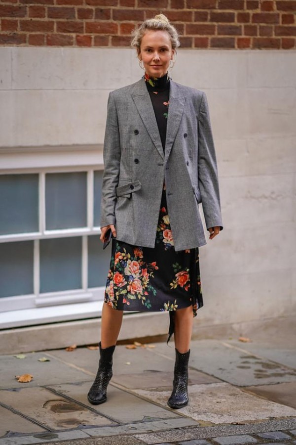 内搭连衣裙,或者半身长裙,都是ok的,脚下一双靴子,塑造层次感。