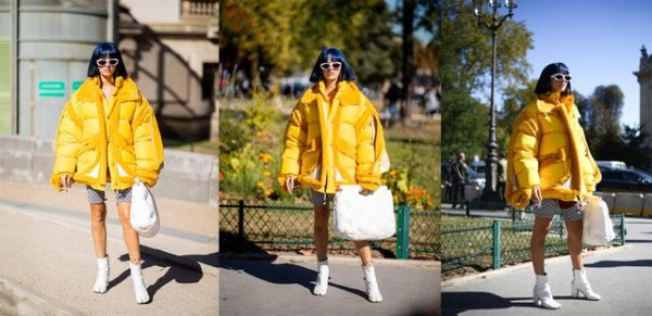 黄色的羽绒服,穿着足够的吸睛,比起中性色调,这种色彩真是一秒摆脱路人感。