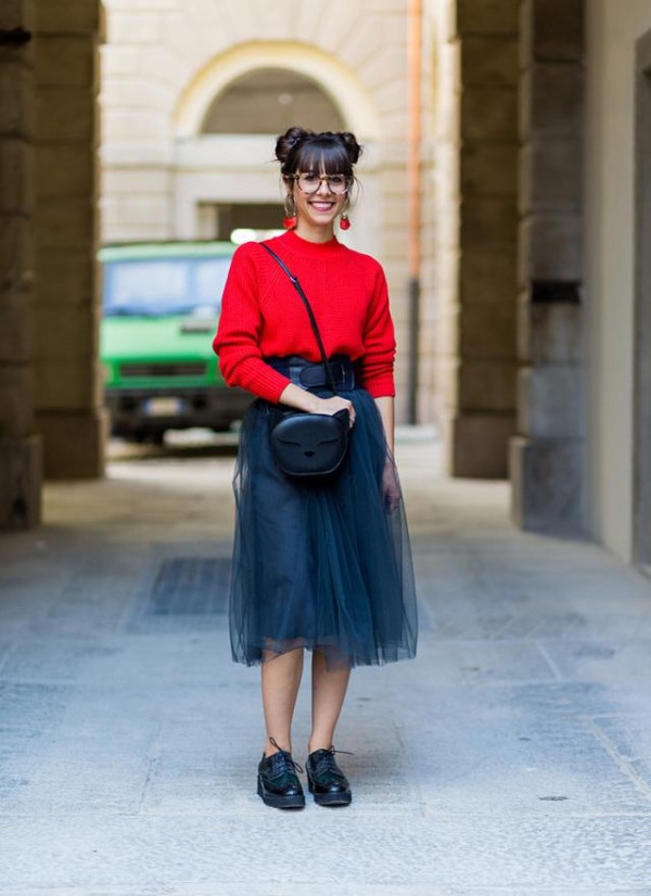 下身搭配一条高腰的黑色网纱裙,红黑撞色,增强了视觉的焦点,也凸显了穿搭的层次感。