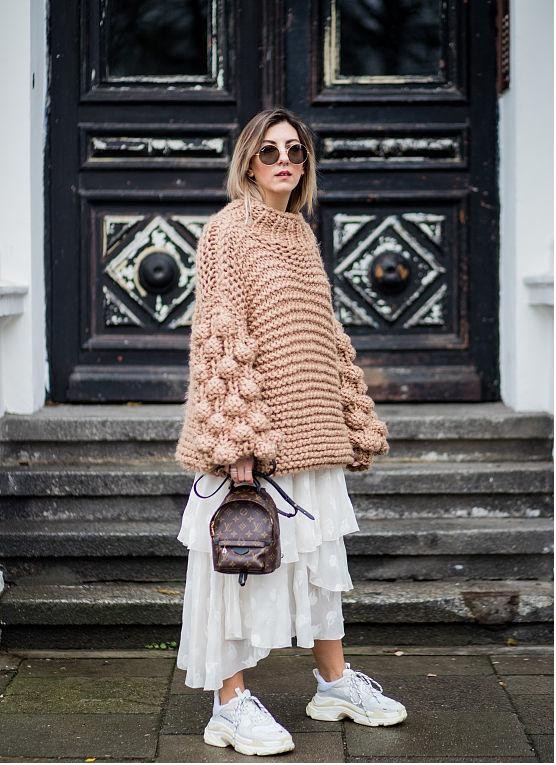 对于比较平常的穿搭,毛衣与半裙的结合,也能塑造这种上暖下冷的穿搭方式。