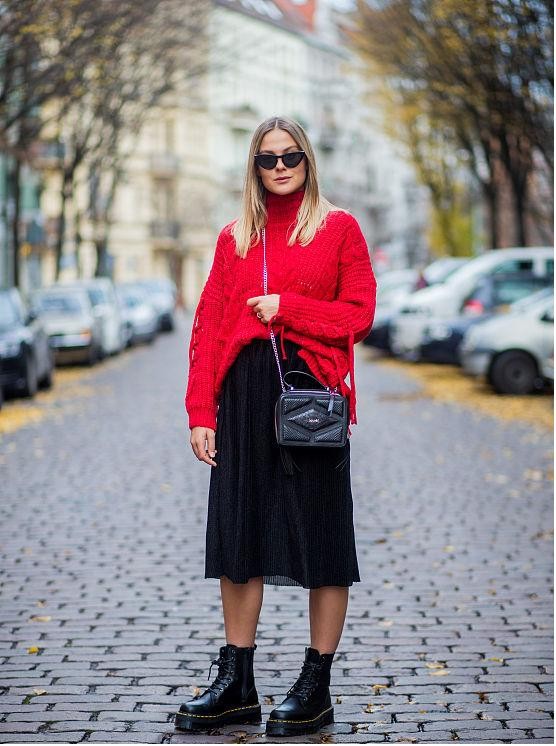 吸睛的红色针织衫,带来了穿着的时髦感,同时也打破了单调与乏味性,给素雅的秋冬look带来些许活力。