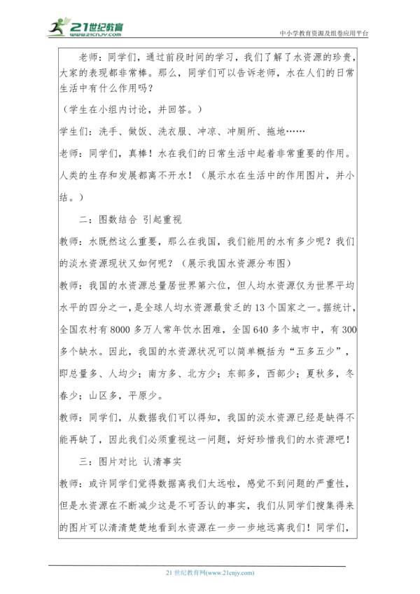 教学过程 一、引导思考 展示图片 老师:同学们,通过前段时间的学习,我们了解了水资源的珍贵,大家的表现都非常棒。那么,同学们可以告诉老师,水在人们的日常生活中有什么作用吗? (学生在小组内讨论,并回答。) 学生们:洗手、做饭、洗衣服、冲凉、冲厕所、拖地…… 老师:同学们,真棒!水在我们的日常生活中起着非常重要的作用。人类的生存和发展都离不开水!(展示水在生活中的作用图片,并小结。) 二:图数结合 引起重视 教师:水既然这么重要,那么在我国,我们能用的水有多少呢?我们的淡水资源现状又如何呢?(展示我国水资源分布图) 教师:我国的水资源总量居世界第六位,但人均水资源仅为世界平均水平的四分之一,是全球人均水资源最贫乏的13个国家之一。据统计,全国农村有8000多万人常年饮水困难,全国640多个城市中,有300多个缺水。因此,我国的水资源状况可以简单概括为“五多五少”,即总量多、人均少;南方多、北方少;东部多,西部少;夏秋多,冬春少;山区多,平原少。 教师:同学们,从数据我们可以得知,我国的淡水资源已经是缺得不能再缺了,因此我们必须重视这一问题,好好珍惜我们的水资源吧! 三:图片对比 认清事实 教师:或许同学们觉得数据离我们太远啦,感觉不到问题的严重性,但是水资源在不断减少这是不可否认的事实,我们从同学们搜集得来的图片可以清清楚楚地看到水资源在一步一步地远离我们!同学们,请看一看,比一比,水去哪里啦?(展示江河水位的变化图片) 教师:同学们,由这些江湖水位的前后变化,大家有什么感想? 学生:...... 教师:同学们,说得真好!我们确实是需要好好地珍惜水资源,这样子美丽的江湖才有可能再次出现在我们的眼前。 教师:同学们很认真也很细心,能够找到这么有说服力的图片。 四:呈现事例 引发共鸣 教师:水资源对我们来说很重要,但水却因为我们的不正当使用在不断减少,它已经向我们发出警告了。我国北方地区经常发生旱灾,许多地方经常发生人畜饮水困难的现象,大家请看另外一组同学搜集的事例图片。(展示我国部分地区缺水严重图片) 教师:同学们,当你们看到这些,此时此刻你的心情怎样呢? 学生:...... 教师:同学们说得非常好,看来 惜水爱水节水刻不容缓啦! 五:真实体验 引起思考 教师:对很多同学来说,可能认为只要打开水龙头,就会有源源不断的水,觉得没必要节水啊!可假如今天家里停水了,会发生什么呢? 学生:停水时,不能洗脸、做饭、上厕所......(学生汇报) 教师:偶尔的一次停水,就会让我们感受到水对我们如此的重要,水与我们的生活息息相关,必不可少! 六:浪费现象 我有印象 教师:水对我们是那么的重要,但是在日常生活中,人们往往不经意间白白浪费了大量的水,同学们搜集的这些现象,你有印象吗?(展示生活中浪费水的图片) 教师:由于我们缺乏节水意识,所以浪费水的现象时有发生。同学们,节约用水并不是要我们做出或这或那的伟大贡献,只要我们树立良好的节水意识,从点滴做起,从身边做起,从我做起,从关好水龙头做起就可以啦! 七:节水我有招 教师:面对缺水的现实,我们从家庭细节做起,我们能做什么呢?我知道同学们从生活中搜集了很多好的家庭节水方法,我们大家一起来讨论整理这些节水妙法,一起动手制定家庭节水方案吧! 学生:...... (学生讨论并整理搜集所得的节水方法) 教师:同学们太棒啦!我们的家庭节水方案基本初步完成啦。老师觉得我们课后可以把这份方案再更加的细化,或者再划分成具体的几个方面,例如厨房节水、洗衣节水、马桶节水等等。 结束语 教师:水是人类生命的摇篮,水是人类赖以生存和发展的重要资源之一,是不可缺少、不可替代的特殊资源。节约用水是每个公民应尽的责任和义务。其实,我们身边还有许多可以节水的小窍门,只要我们留心,我们还可以做得更多、更好。