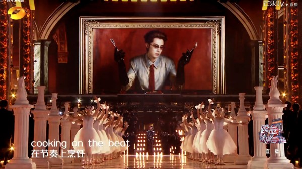 《将进酒》通过光影与AR虚拟影像的叠加,构建出“山峦—云海—行舟”的层次化意境空间。AR生成的写意云海则突破物理边界,将体育场转化为流动的山水画卷。其中“舟行云海”的意象,以超现实手法将古人置于悬置时空,形成历史与当下、实境与虚境的诗意对话,强化了节目文化穿越感的沉浸体验。