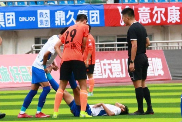 北碚队球员第一时间协助对手拉伸。