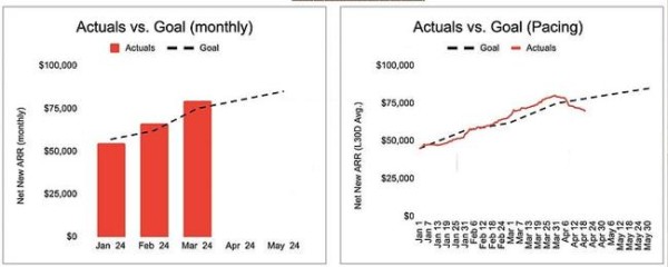示例:假设您想查看销售团队在本月(4月)的表现。这是本月的第15个工作日,目前的收入为26,000美元,而目标是50,000美元。忽略季节性因素,看起来团队会错过这个机会,因为您只剩下6个工作日了。