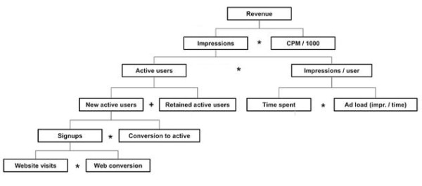 从高级收入公式开始(例如,对于基于广告的业务,公式为“收入=展示次数*CPM/1000”),然后进一步细分每个部分以找到潜在的驱动因素。确切的收入公式取决于企业的业务类型。