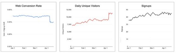 示例场景:在上图中,您看到网站上的访问到注册转化率大幅下降。您没有惊慌,而是查看了总注册人数,发现该数字保持稳定。