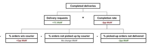 根据这个驱动因素树,我们可以排除需求方。相反,我们发现我们最近很难找到司机来接订单(而不是餐厅<>快递员交接或食物投递中的问题)。
