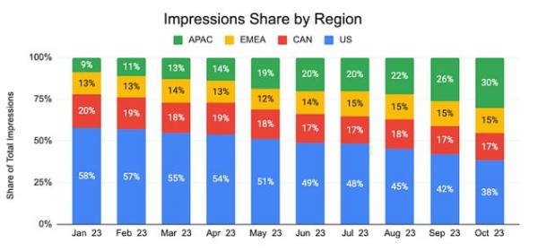 同样,了解确切的根本原因可以做出更有针对性的响应。根据这些数据,团队可以尝试重新激发高CPM地区的增长,考虑为亚太地区提供额外的盈利选择,或者专注于通过在庞大的亚太市场中大幅增加展示量来弥补单个展示价值的下降。