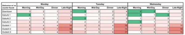 然而,当我们为“未找到快递员的配送请求”这一指标创建时间和地理热图时,我们发现晚上受影响最大的是郊区: