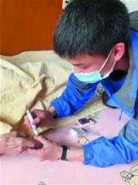 养老关乎民生和发展,是关系社会和谐的大事。解决养老问题关乎城市的未来。如何让老年人老有所依,幸福安度晚年,早报常青树周刊推出社区养老模式探访系列报道。王佃聪在给老人测量血糖。陈西宁在给老人理发。