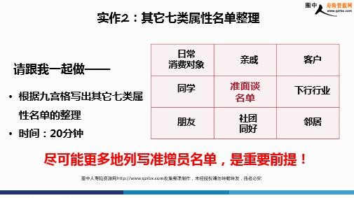 1、日常消费对象:日常生活购买有过购买服务的商店老板或工作人员 2、亲戚:直系/旁系 3、客户:成交保险的客户,或未签单成功适合增员的对象 4、同学:中小学/大学、MBA时期均可 5、下行行业:房地产、教培、受线上销售影响的线下实体门店等 6、朋友:日常关系相处较好,特别是近期遇到职业困境 7、社团同好:爬山/钓鱼/书友/俱乐部/商会等认识的人 8、邻居:对门、楼上楼下、一个社区