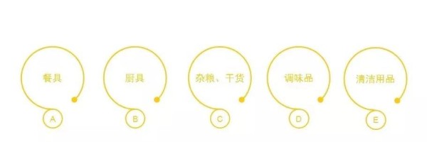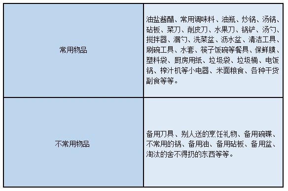 物品分类将同类的物品放在一起,便于查找和取用。厨房内物品常分为: