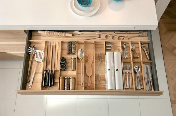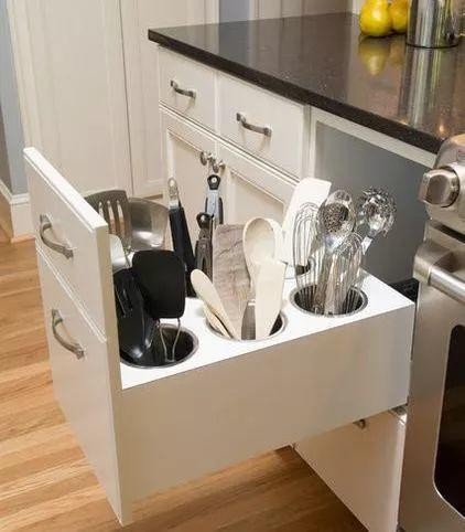 抽屉高度较高时,还可以在抽屉内部设置成垂直收纳,用于放置刀具、擀面杖等长状厨具。边角合理运用