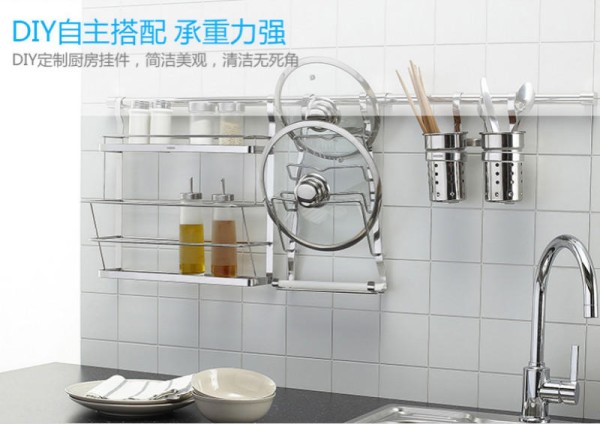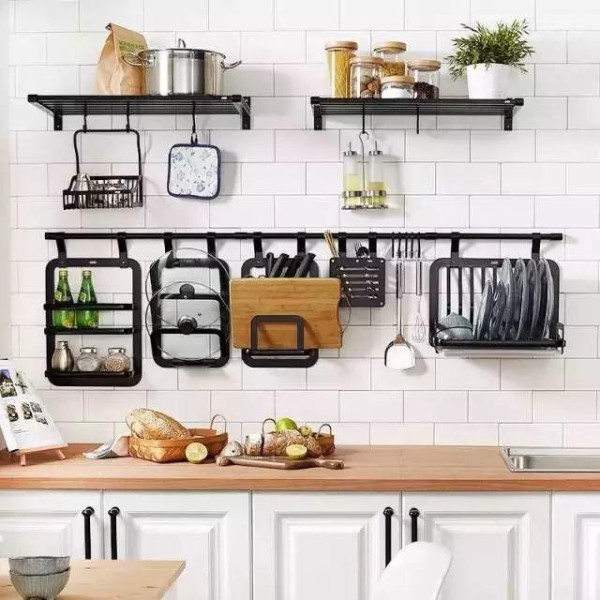 如果厨柜自带的柜子数量少,无法放置太多的物品。可以考虑往墙上走,在墙上设置隔板和挂钩的组合,随拿随用,也是很方便的。