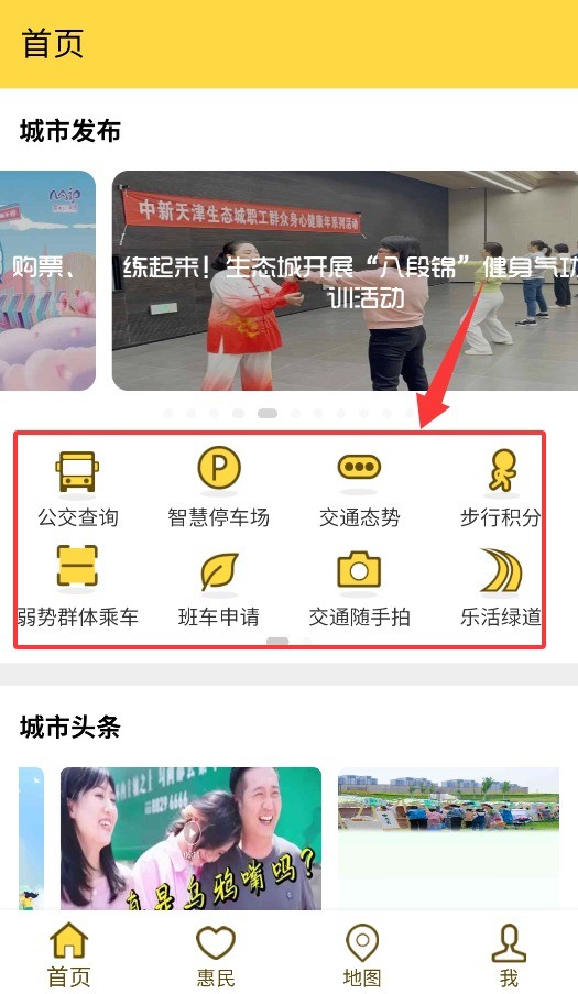 2、首页提供公交查询、智慧停车场、交通态势、步行积分等城市服务功能。