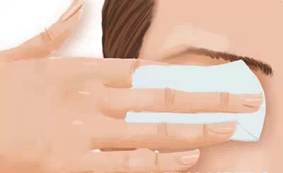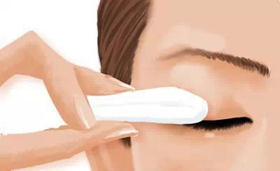 将化妆棉浸透卸妆液,轻轻按在眼睛上3~5秒,让睫毛膏、眼影、眼线等彩妆与卸妆液充分融合,然后向外轻轻擦去彩妆。