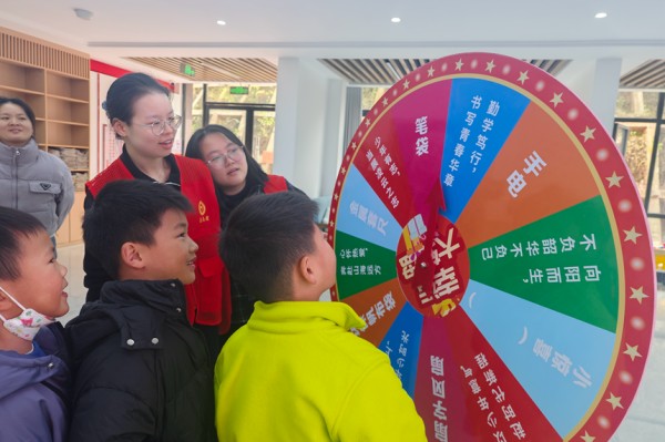 活动现场,印有“书写青春华章”“明法崇德向善”“笃行致远逐梦”等标语的普法转盘引人注目。每当参与者转到相应标语,普法志愿者便结合内容解读法治内涵,引导孩子们理解尊法守法、勤学笃行的重要性。10岁小学生李诺转到“法治护航成长”后,志愿者向她讲解了关于禁止向未成年人售烟等规定,帮助她认识到法律对青少年的特殊保护。