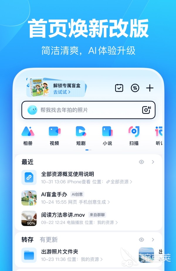 百度网盘已深度融入AI能力,构建起覆盖学习、生活与办公全链路的智能服务生态。其AI相机支持拍摄即优化、自动裁剪与高清存档;AI笔记可对课件、讲义等内容进行语义解析并生成条理清晰的知识摘要;简单听记则能将会议录音实时转写为结构化文字纪要,大幅提升信息沉淀效率。