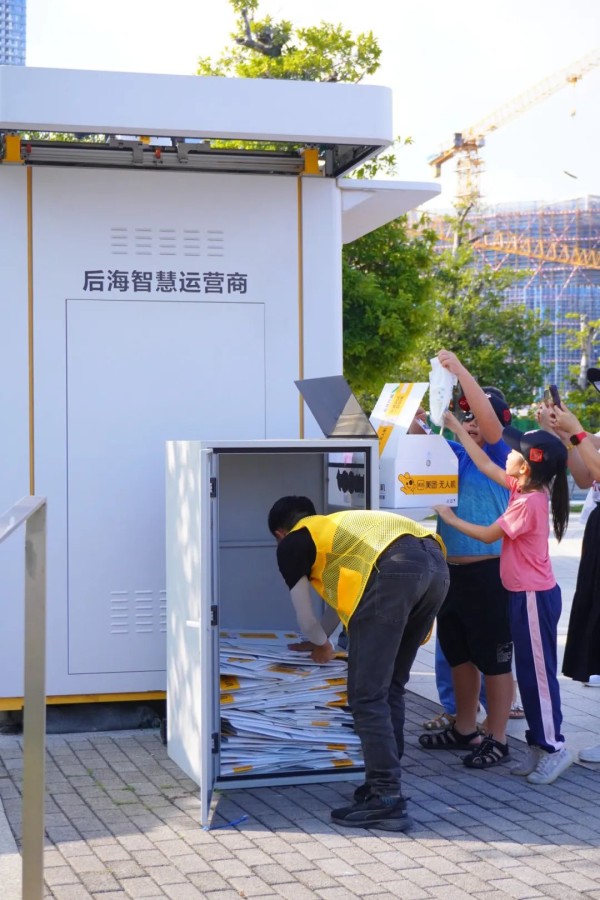 作为游客密集的公园景区,人才公园和世界之窗的订单量则比小区大得多,折叠后的箱子将回收柜塞得爆满。路过的游客会因为好奇、定位难、景区内竞品贵等原因选择使用无人机外卖,并围在空投柜边等待,拍照。