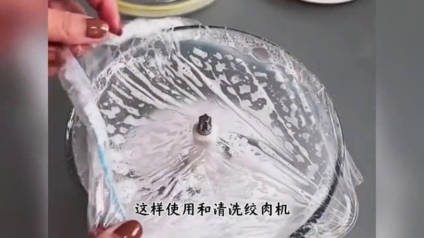 ·6.绞肉馅的时候套上一个保鲜套,中间开个小孔盖上盖子,正常的按绞肉功能,肉馅打好以后机头很干净,盖子也很干净。清洗也有妙招,直接放洗洁精加一半的热水,盖子原样放回再次按下绞肉功能键,这样使用和清洗绞肉机才是最正确的使用方法。
