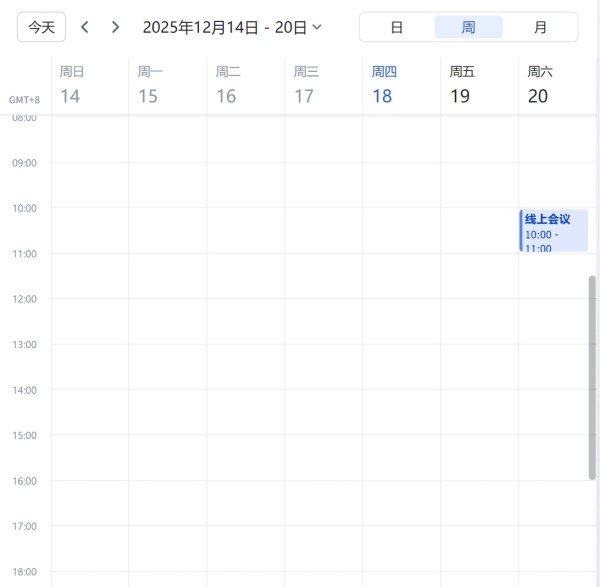 | 周三 | 10:00-11:00 | 项目会议 | 必须 | 线上 |