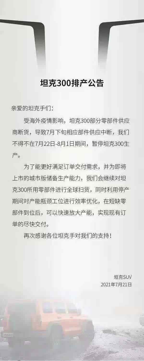 只不过,厂家方面也没有预计,现款的坦克300能有这样的销售成绩,加上即将上市的坦克300城市版铺货,导致整体产能稍显不足。为了能让更为亲民的坦克300城市版,铺货速度更快,所以暂缓现款坦克300的生产,时间为7月22日至8月1日。