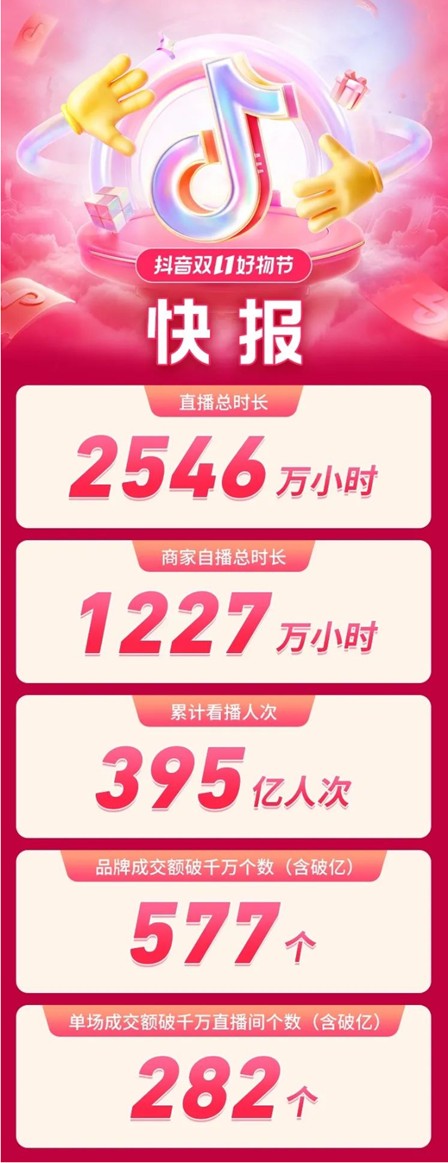 钛媒体APP从抖音电商方面获悉,今年“抖音双11好物节”,直播总时长达2546万小时,直播间累计看播人次395亿。