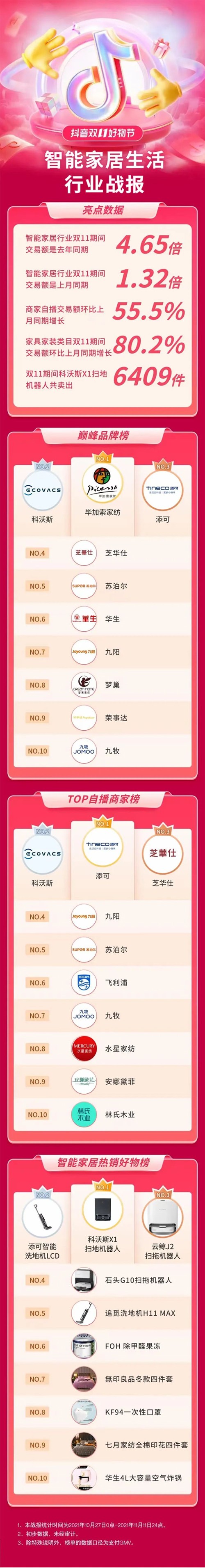 智能家居生活品类,成为了大促期间的一个新亮点。抖音电商“双11”期间,其交易额是去年同期的4.65倍。传统上认为发展较慢的智能家居品类,在抖音电商上已经找到适合生存的土壤。