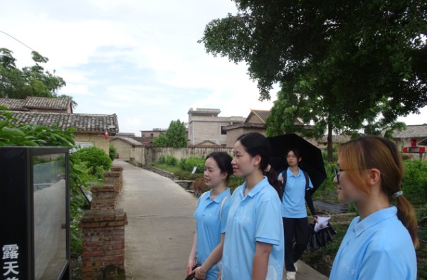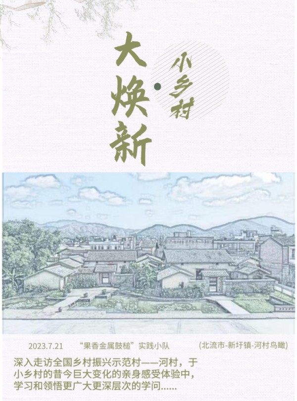 从村口的村委会出发,路过了一排排的民房,民房由设计师专门设计,各具特色。每一间房子的装修风格不一,依山傍水,因地制宜,风景美如画。李书记向团队介绍道旧村的房屋都由村委会统一征用改造,以“新房子好看,旧房子好用”为主要原则,盘活现有房屋资源,发展现代化观光旅游、电商等。随后,一行人来到由旧房改造的村史馆,在李书记的讲解中了解河村发展史,体会由一代代河村先辈们共同奋斗出来的河村。村史馆内的河村改造前后对比图,展现这一代的青年在党的统一领导下团结协作进行三清三拆工作。团队注意到,村史馆内有别具特色的的旧物展示,这些旧物如上世纪居民“三大件”、煤油灯、吹谷机等都由村民无偿捐赠,蕴藏着河村的历史与文化底蕴。所谓鉴往知来,从村史馆了解到河村的过去如何形成,明白了河村的现在如何建设,建设者必将能更知道河村的未来如何发展。