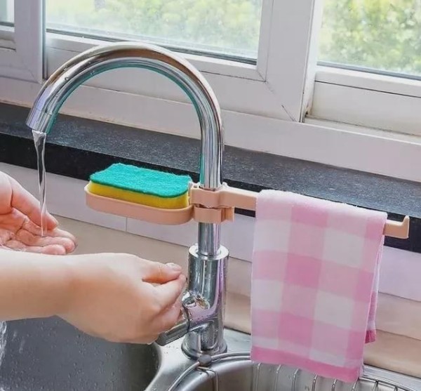 在洗完抹布、钢丝球等洗刷用品时,不要随手扔在洗手台上也可以减少洗手台满是水的状态。可以利用水龙头,在水龙头上方挂置一个水槽沥水架,用来收纳抹布、钢丝刷等用品,沥水效果非常好,直接将多余的水分沥在洗手台中,减少洗刷用品弄湿台面的机会。