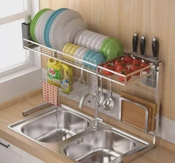 水槽上方的空间,我们也可以放上一个置物架,来收纳一些杂物或者碗盘,这样不仅整齐美观,尤其是清洗和取拿使用的时候超级方便哟!把平时空闲的水池旁的空间利用起来 可以看到能收纳很多平时经常用到的物件,餐盘、锅铲统一摆放,而且还让取用更方便,也就是平时清洁存放的过程,其实就已经做好了收纳工作,整齐有序,也让厨房更显美观。