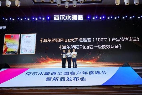 在本次峰会上,海尔骄阳 Plus 热泵冷暖机凭借卓越性能,荣获两项行业权威认证:由合肥通用机电产品检测院颁发的《海尔骄阳 Plus 大环境温差(100℃)产品特性认证》—— 这是行业内唯一获此认证的产品,以及北京中冷通质量认证中心颁发的《海尔骄阳 Plus 四一级能效认证》。